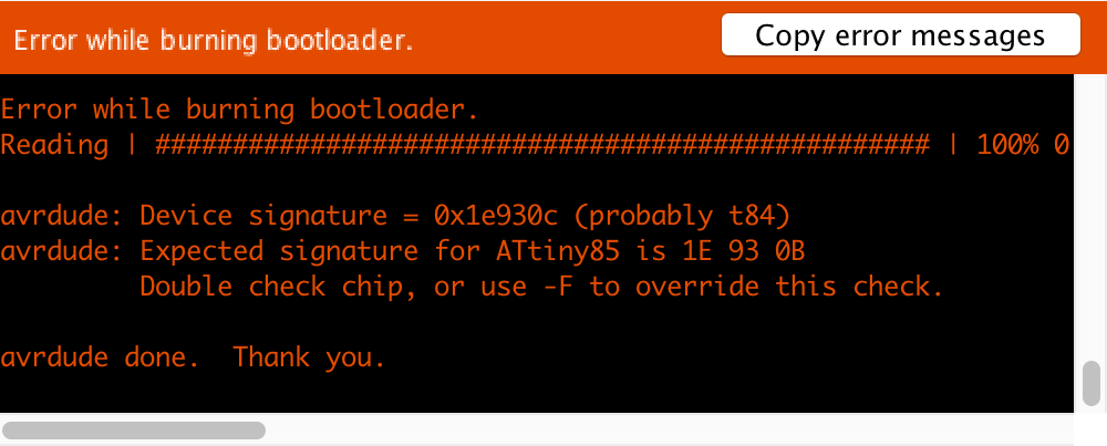When initiating Burn Bootloader, you may receive an error message similar following: