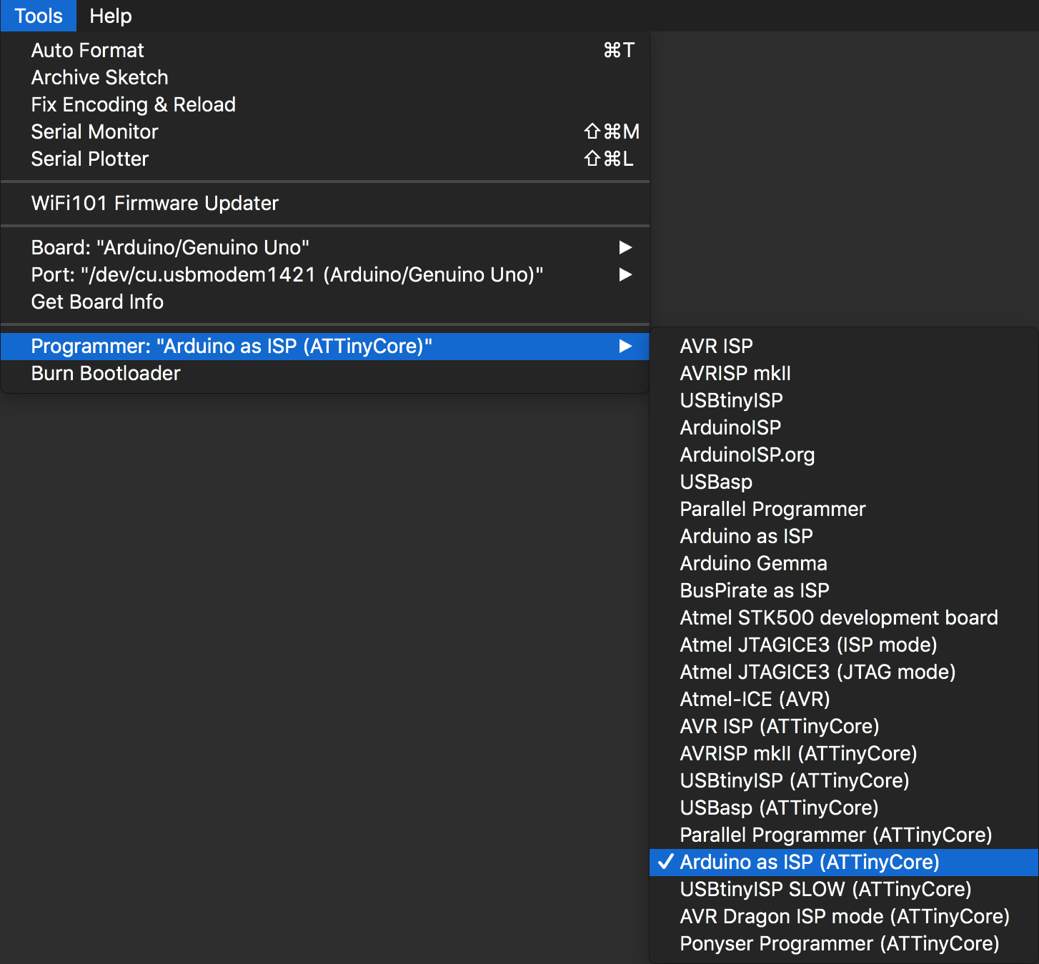 The Programmer is important, and is subtle – easy to forget when programming these MCUs. This tells the Arduino IDE how to behave when uploading your program (to the Arduino UNO, ATtiny, etc.).