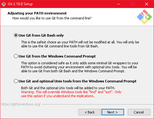 Adjusting PATH environment. We recommend NOT using git in the Windows Command Prompt and to use git exclusivly with Git Bash.