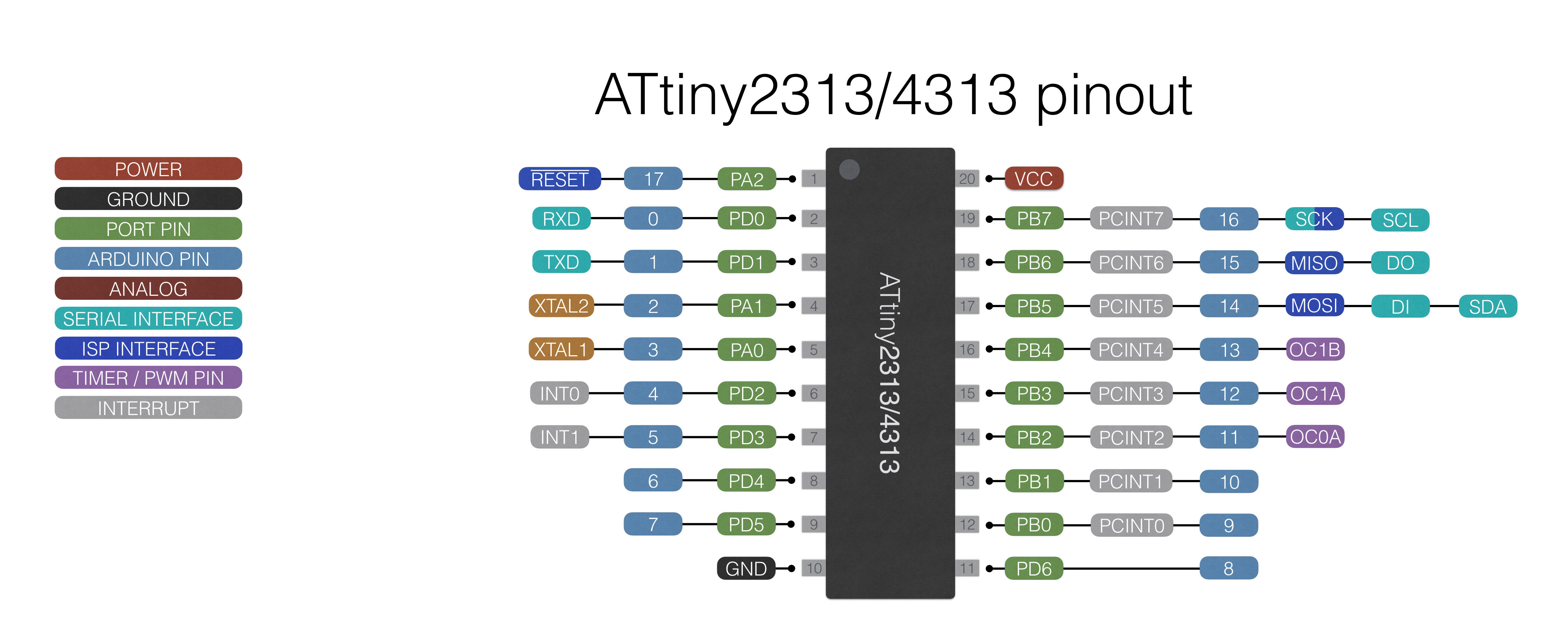 This pinout describes the physical and logical layout of the ATtiny4313. The physical layout are the physical pins - pins one through eight in a counter-clockwise fashion. The logical layout of the ATtiny84 are the numerous labels tied to each physical pin.