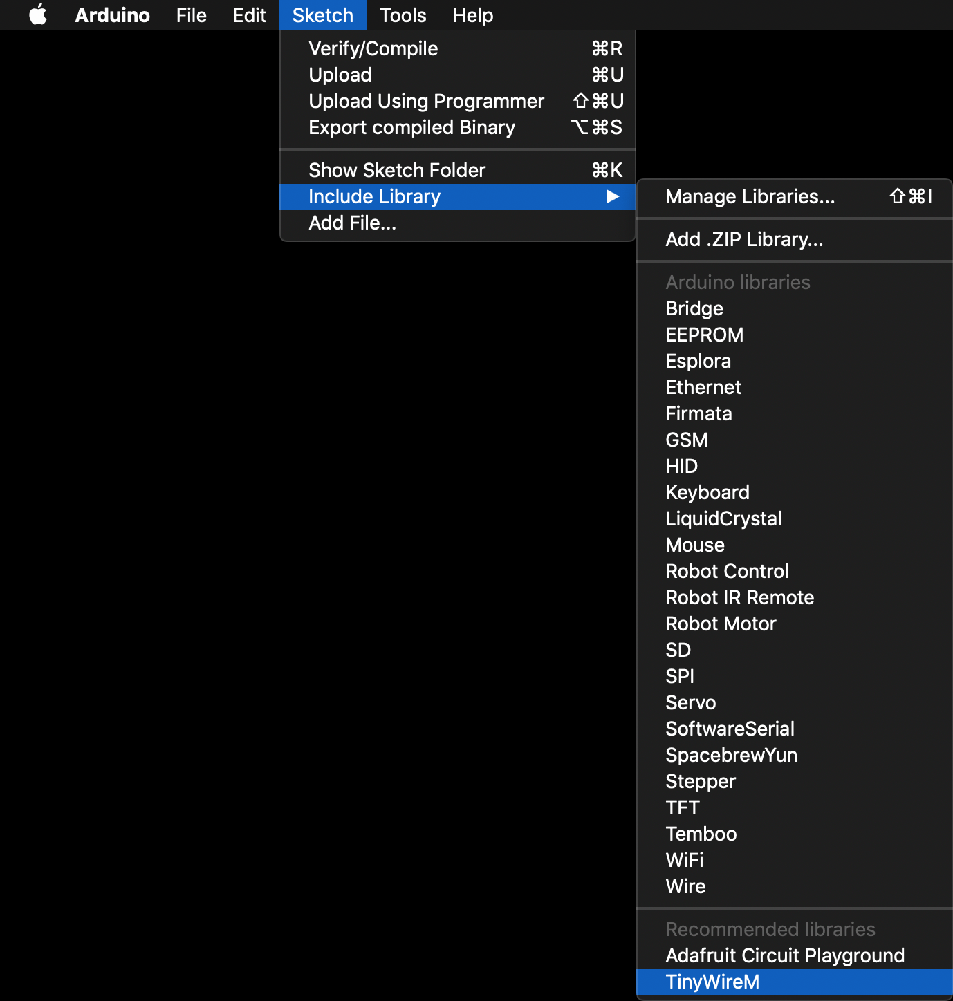 Navigate to MrSwirlyEyes' TinyWireM Repository and follow the Introduction to Arduino Installing an Arduino Library tutorial module to install the TinyWireM library into your Arduino IDE.