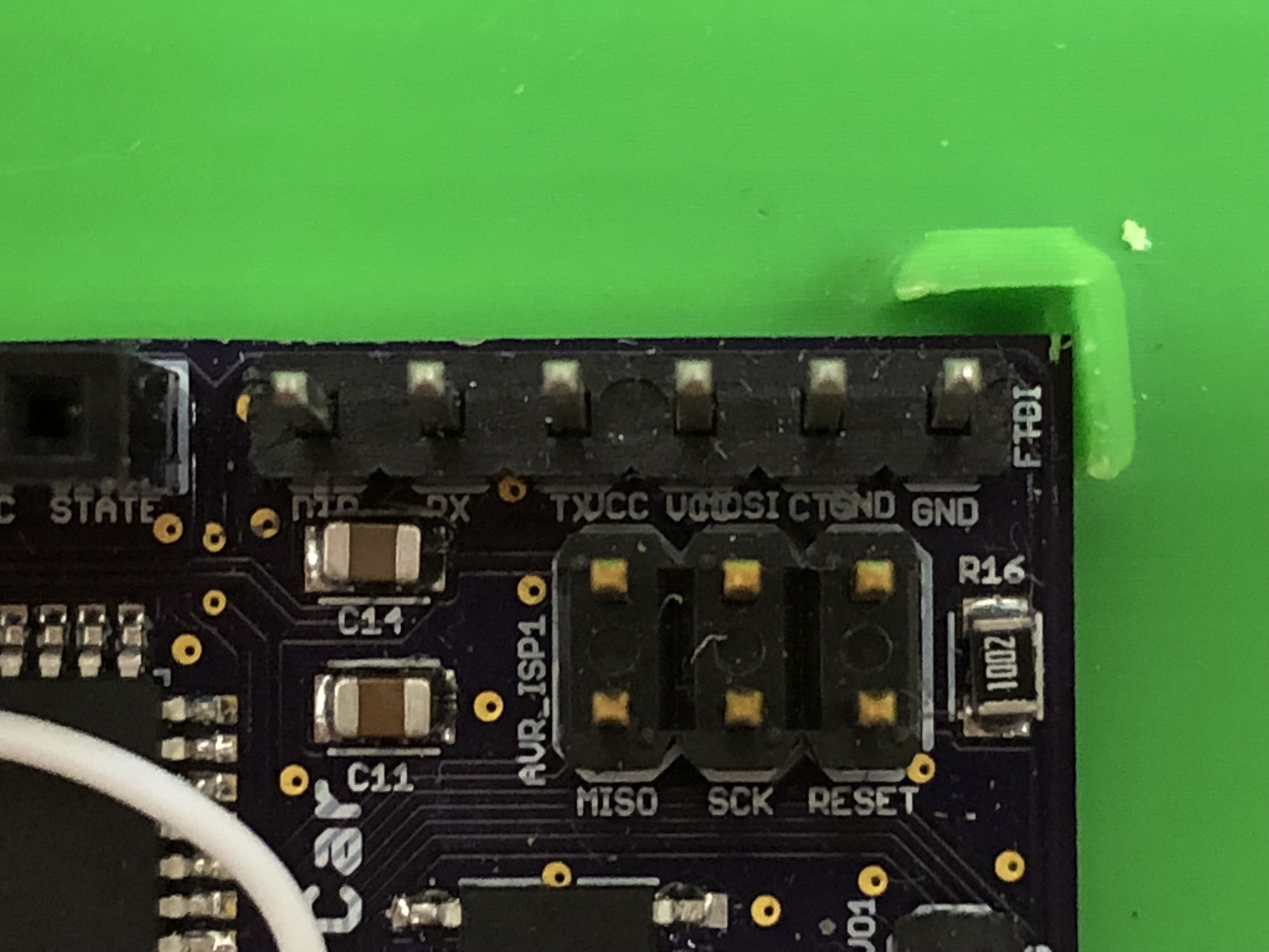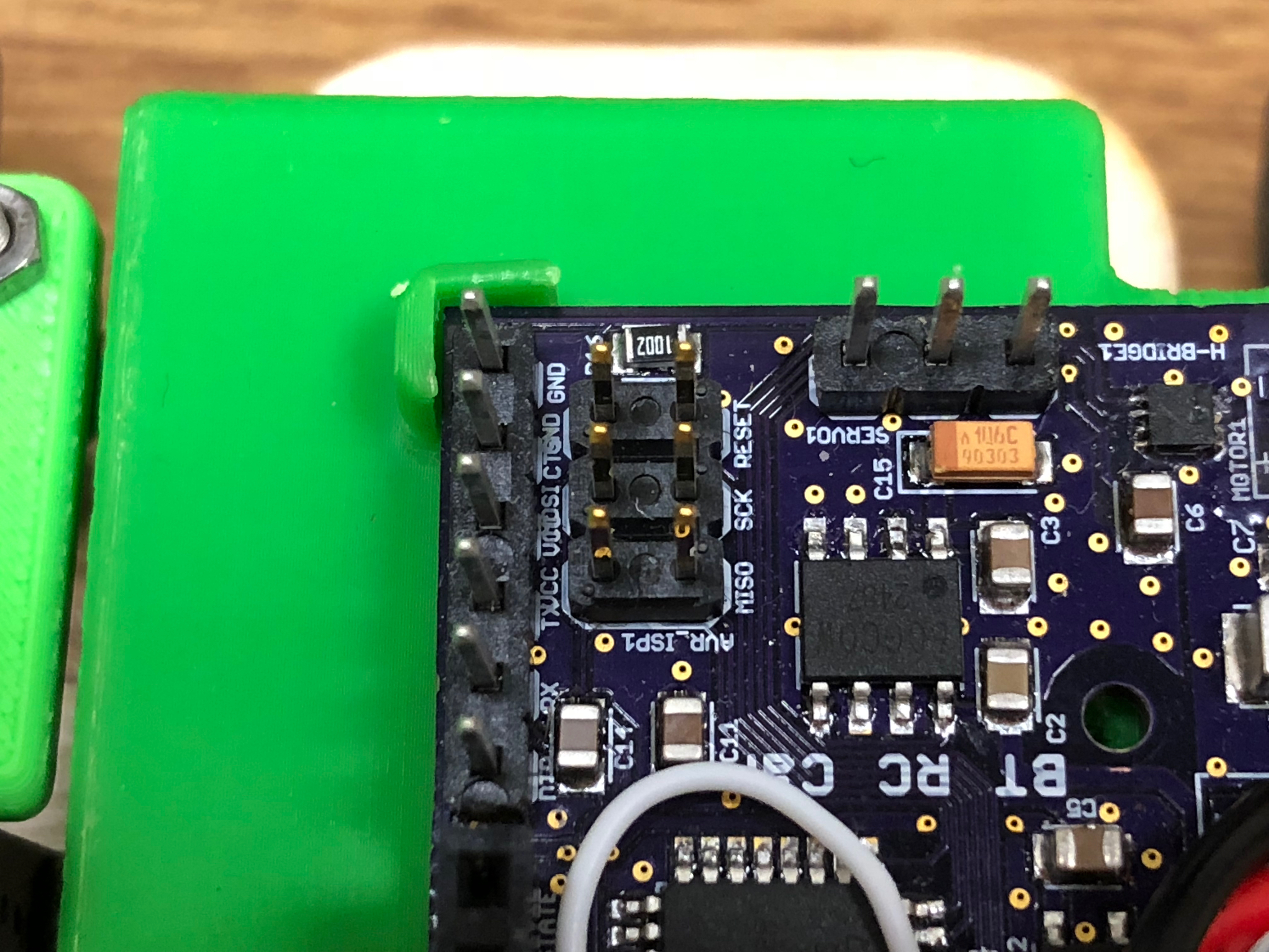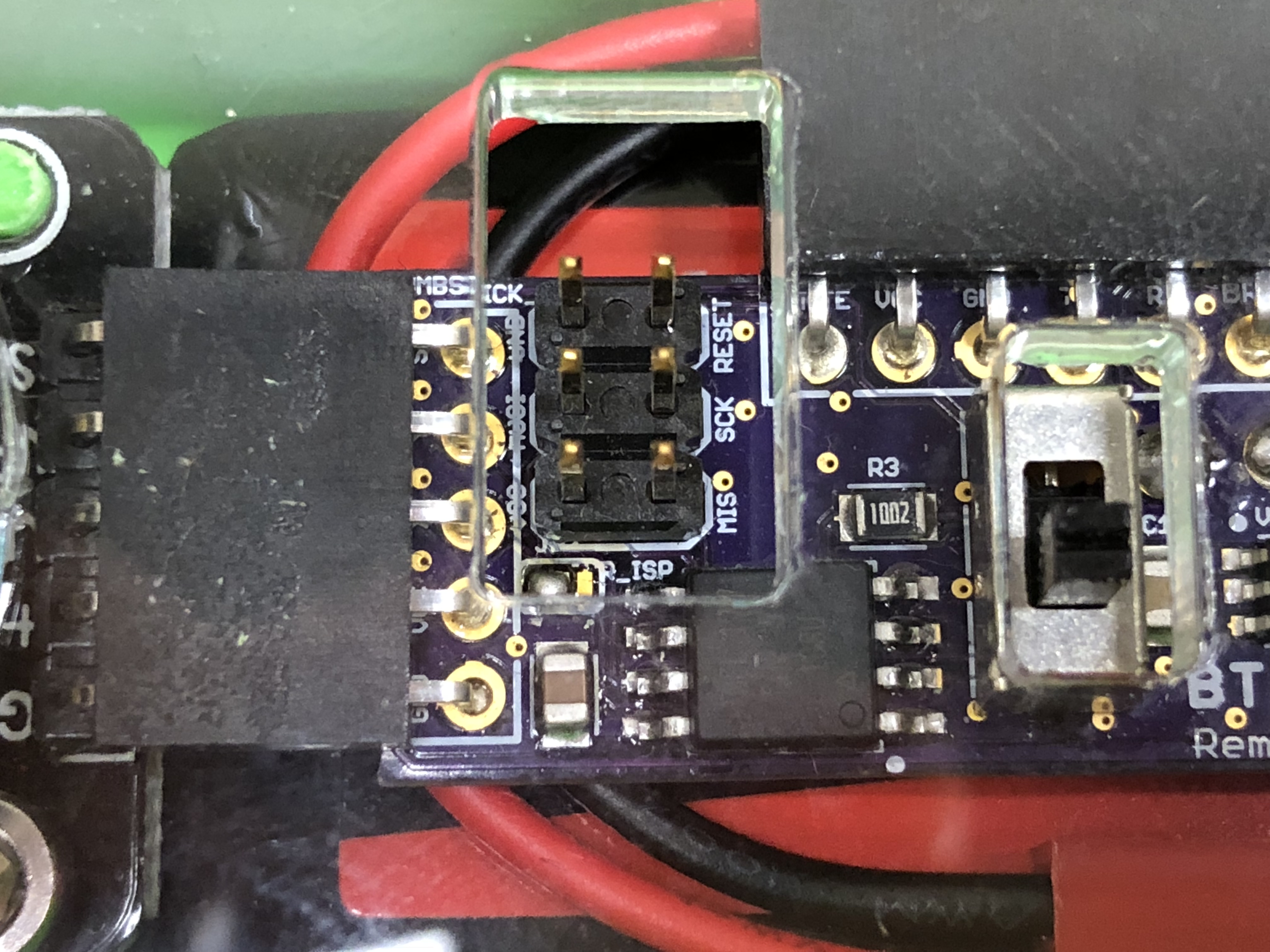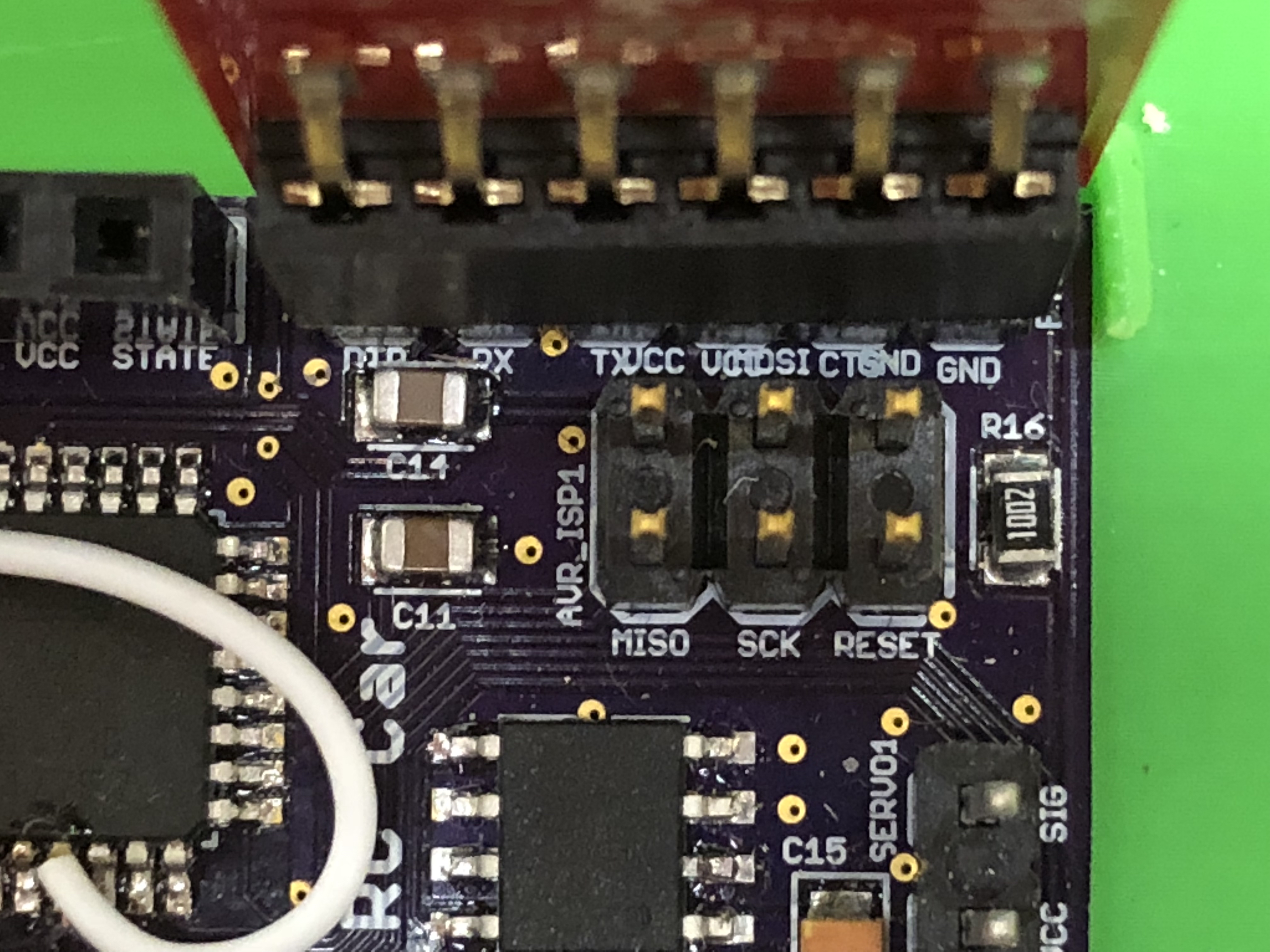 On the vehicle PCB, there should be an AVR ISP header as follows: