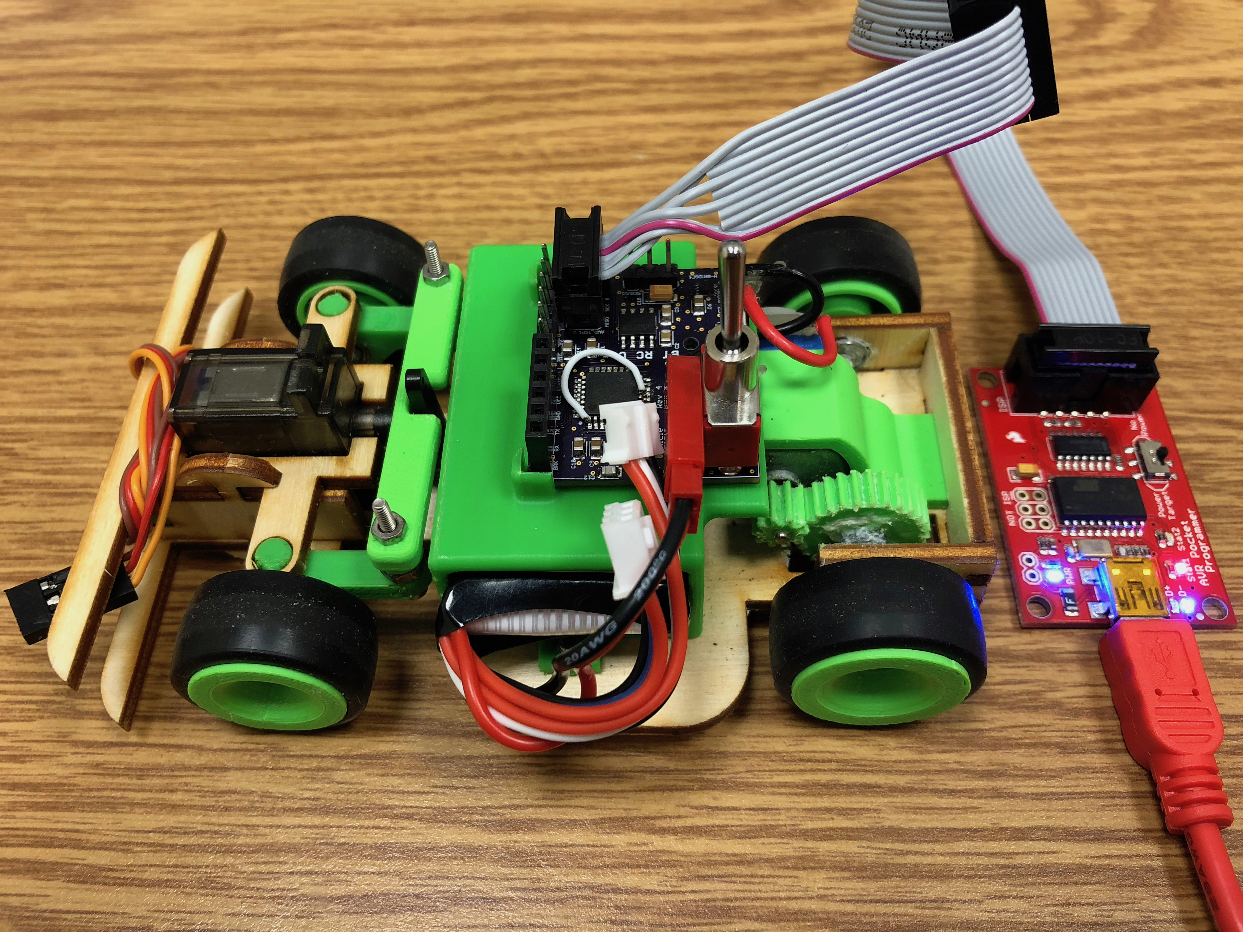 We encourage you to refamiliarize yourself with the AVR Microcontrollers and ATMEGA328p Microcontroller as they provide the general details of bootloading and programming the vehicle (i.e. ATMEGA328p). We will be using the Sparkfun Pocket AVR Programmer to both bootload the vehicle - and this will happen just once. As for programming the vehicle we will utilize the Sparkfun FTDI Basic Breakout (3.3V) device (i.e. Serial Programmer).