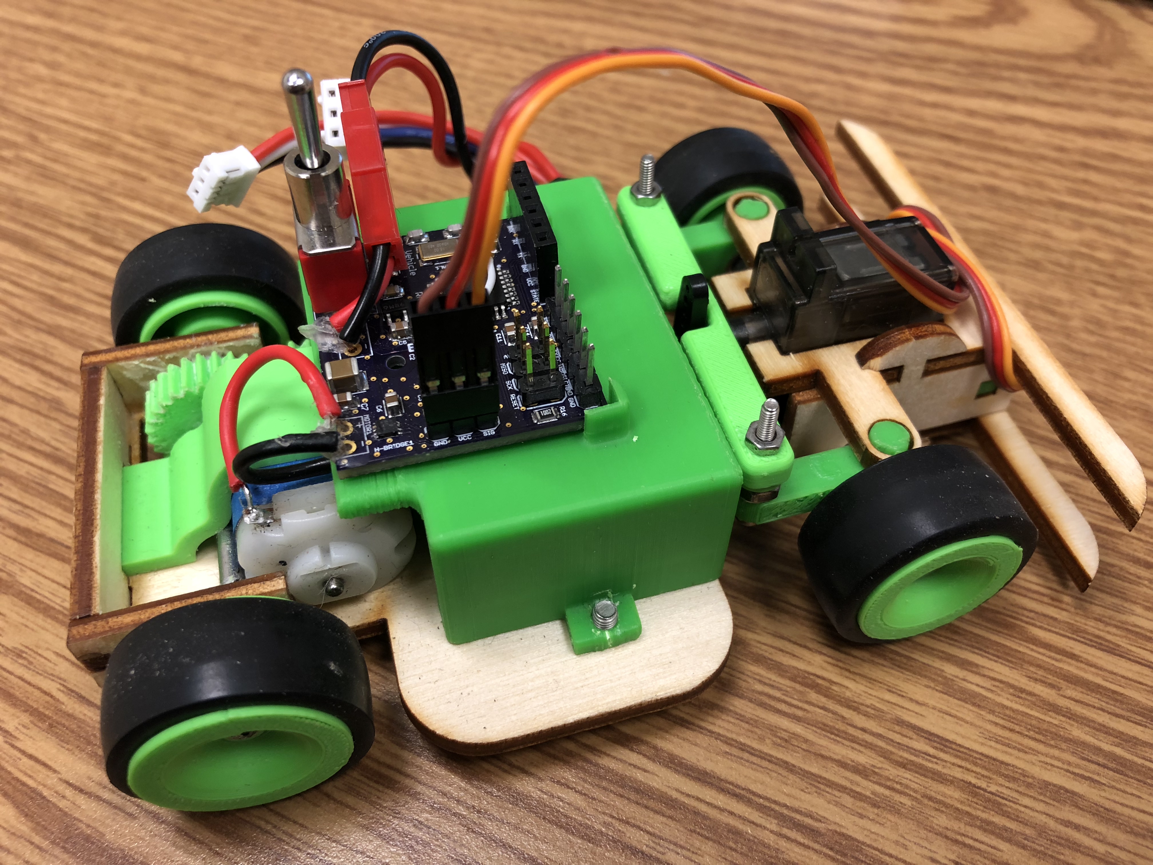 The bluetooth remote control car (BT RC Car) is a wirelessly controlled remote control vehicle. Unlike most remote control (RC) cars you can buy from a hobby store, this RC car can be built from scratch - that is, both the vehicle AND the remote! It is quite zippy, and the handling is decent. However, it is limited in terms of terrain - not recommended for slopes or outside in general. But it is great to keep at your desk or office, to entertain your cats (:3), and for educational purposes. We teach a ton of concepts that go into creating our BT RC Car! How to communicate from device-to-device (e.g. Arduino to Arduino) using a bluetooth module, how to CAD - both PCB and 3D model - your car, programming AVR microcontrollers, and general prototyping circuitry.