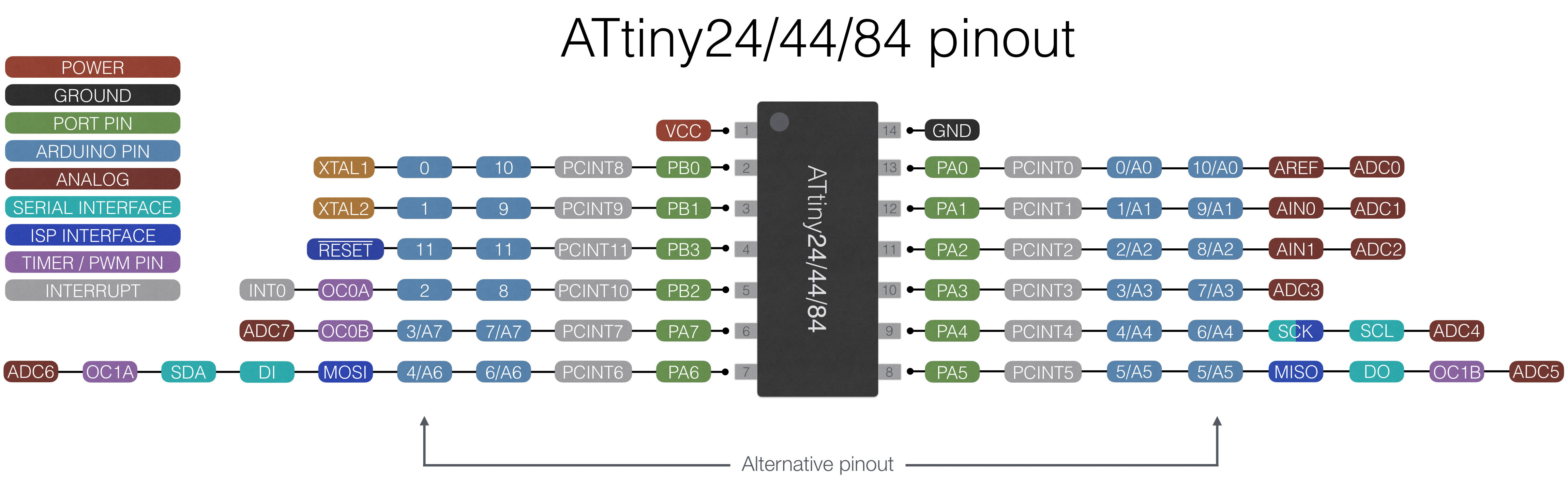 This pinout describes the physical and logical layout of the ATtiny84. The physical layout are the physical pins - pins one through eight in a counter-clockwise fashion. The logical layout of the ATtiny84 are the numerous labels tied to each physical pin.