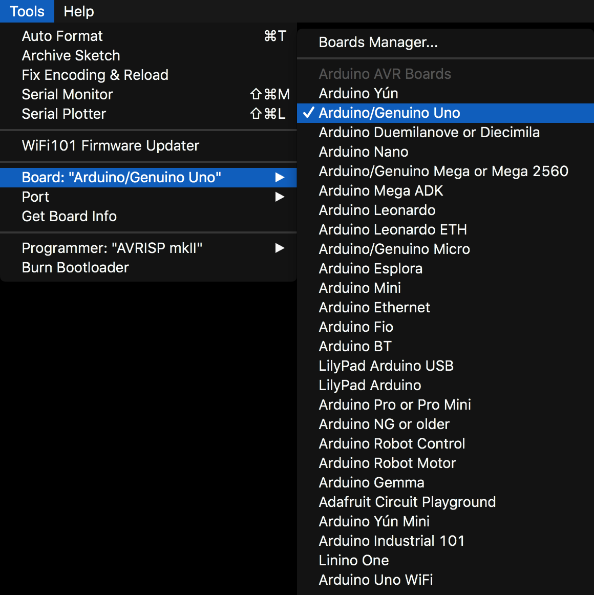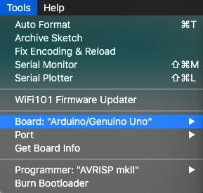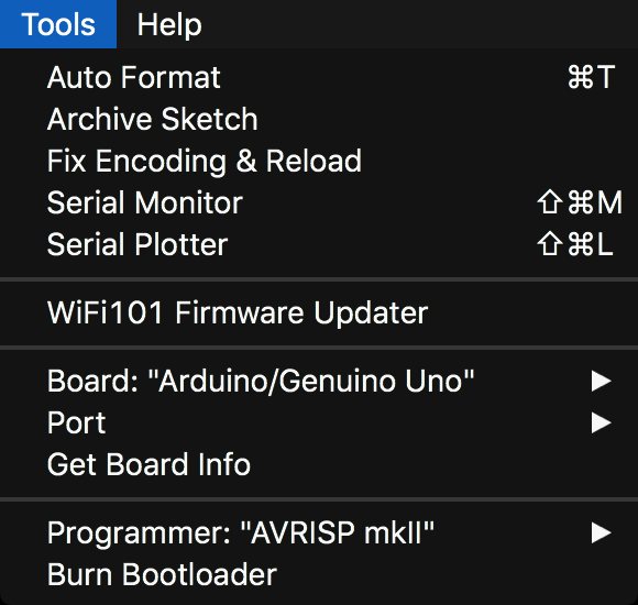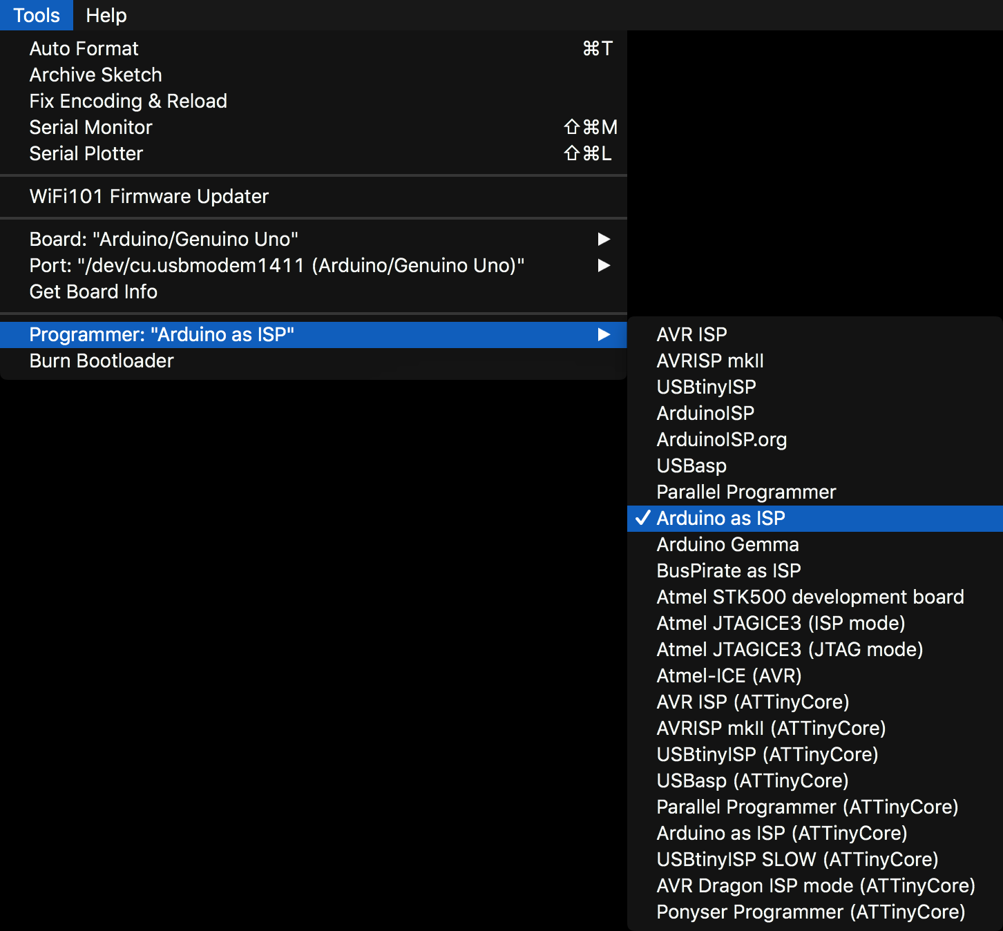 The Programmer is important, and is subtle – easy to forget when programming these MCUs. This tells the Arduino IDE how to behave when uploading your program (to the Arduino UNO, ATtiny, etc.).
