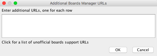 A smaller pop-up window will open where you can paste URLs for additional boards to integrate into your Arduino IDE. Copy and paste the following URL into the window that pops up.