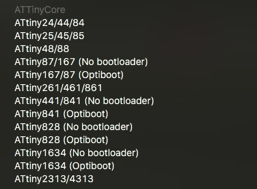 For the ATtiny variants, we will cover the ATtinyX5, ATtinyX4, and ATtinyX313 - however, this same process applies to all of the other ATtiny variants in the ATtinyCore. Observe, there are a few variants for each of these series. The X is a number that represents the amount of flash memory available on the particular chip (in KB, kilobytes). The devices within a series are all identical except in price and amount of memory. However, the X5, X4, and X313 series are quite different from each other, so we will explore each of them separately.