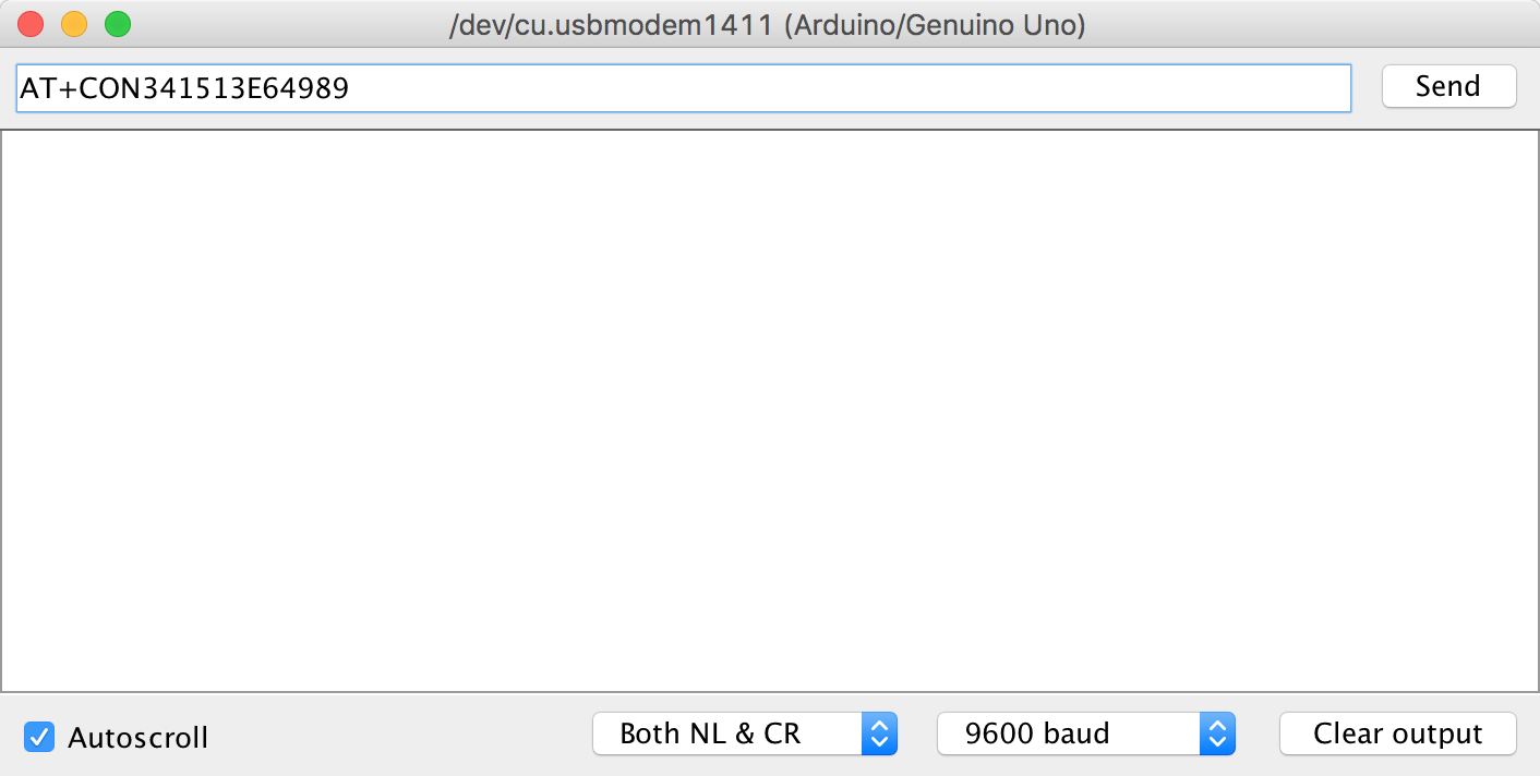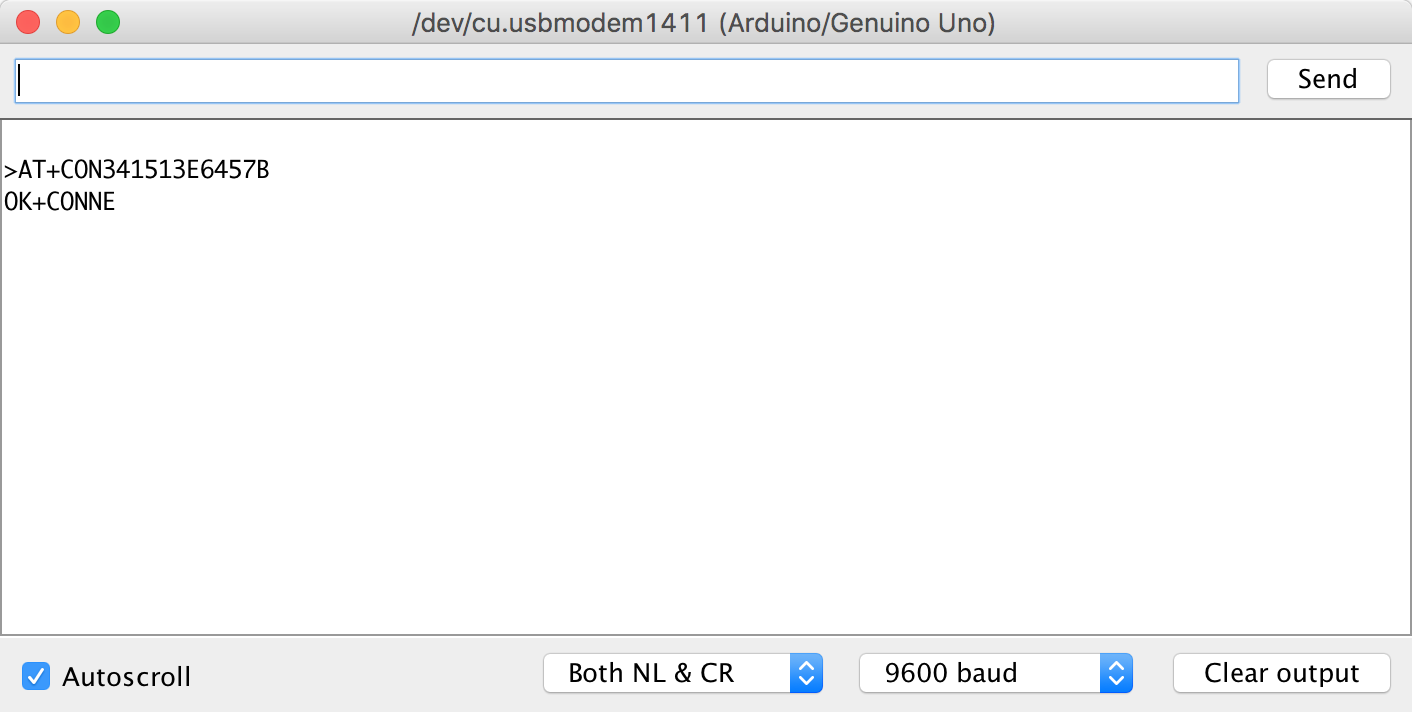 Try to connect to a (MAC) address AT+CON[para1] OK+CONN:[para2] para1: MAC address.