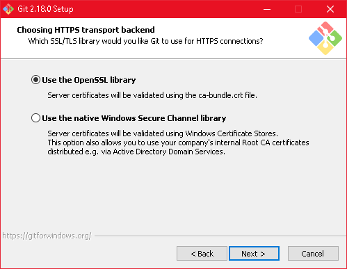 Selecting components. We do NOT recommend the Git GUI. Using the Git Bash CLI (command line interface) is how you shouild use git. We additionally added the Check daily for Git for Windows Updates.