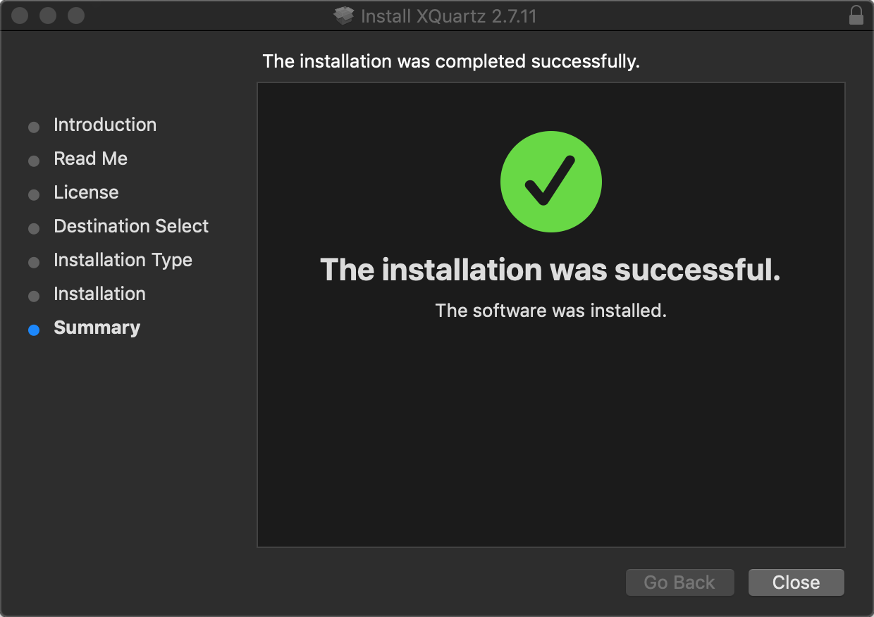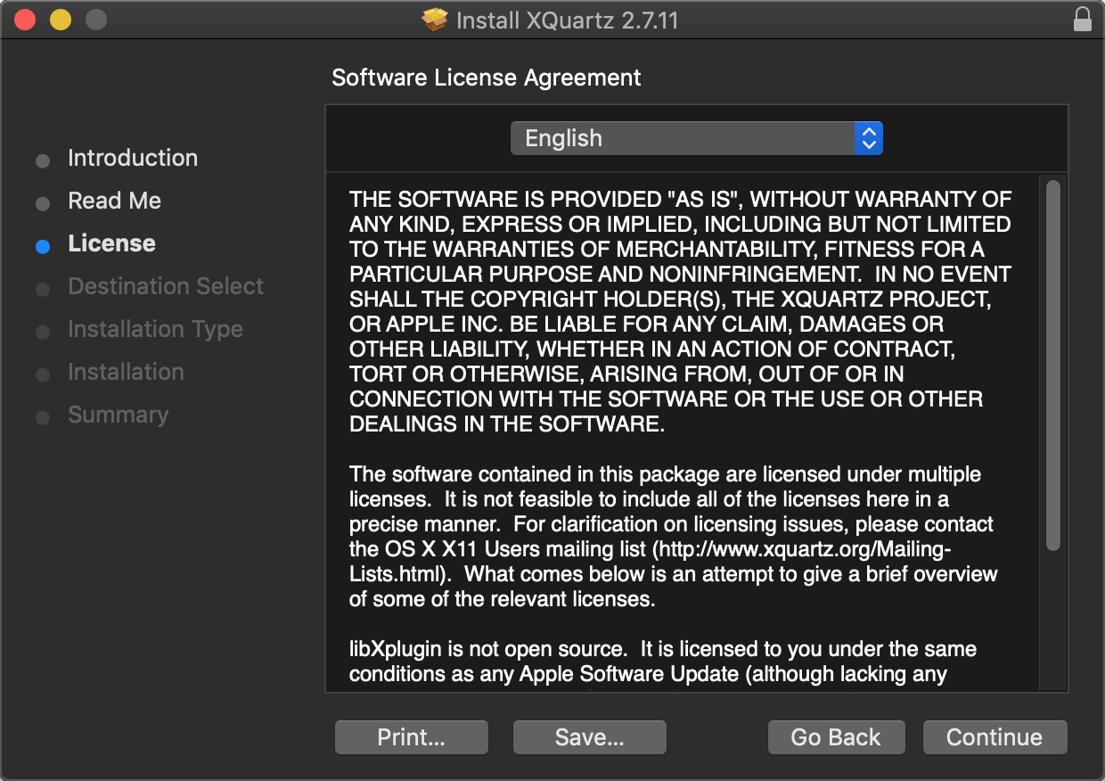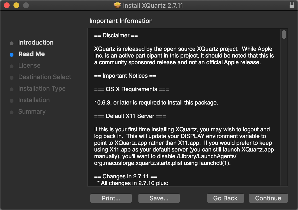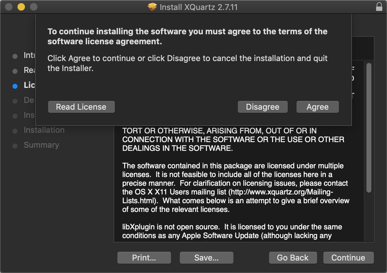 Click to install XQuartz. You may need to provide an administrative password to give the installer permission.