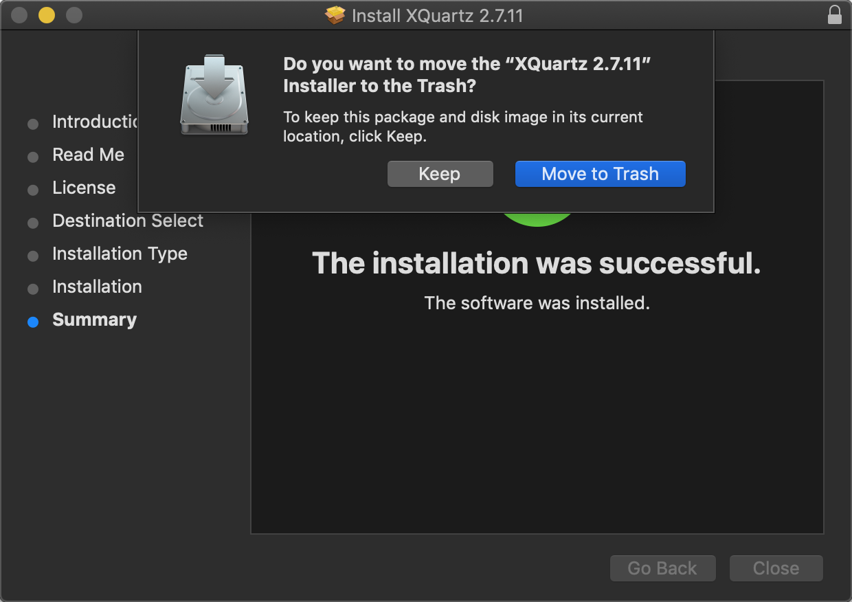 Clicking close on the installer will prompt you to move the installer to the trash.