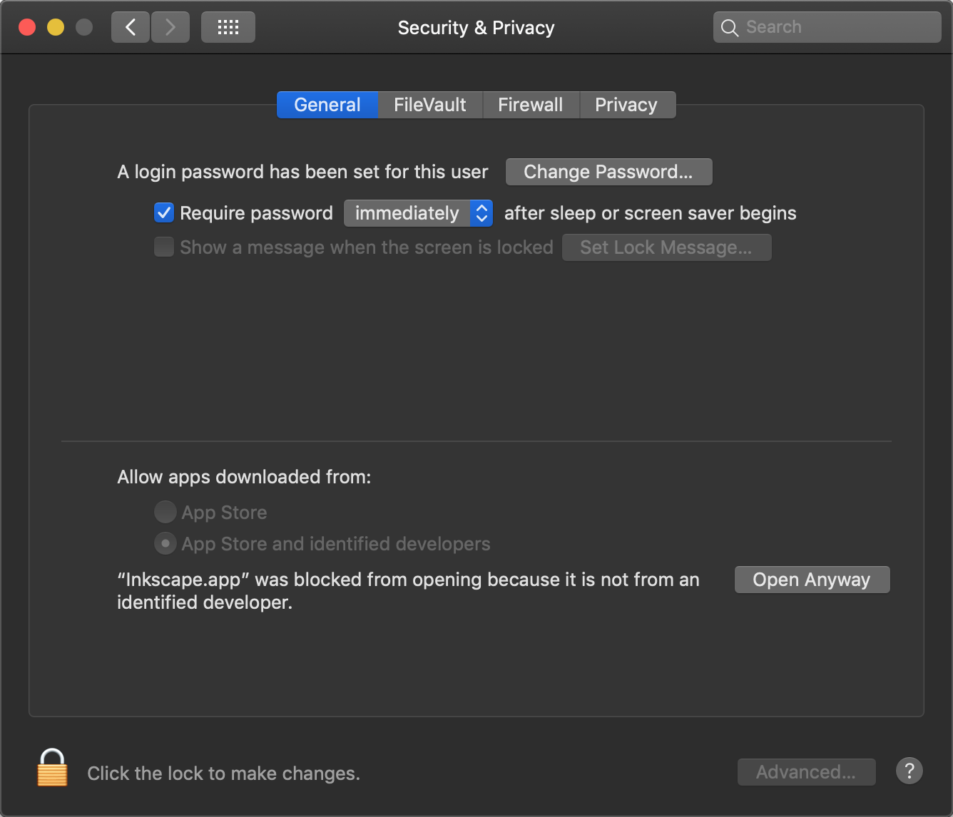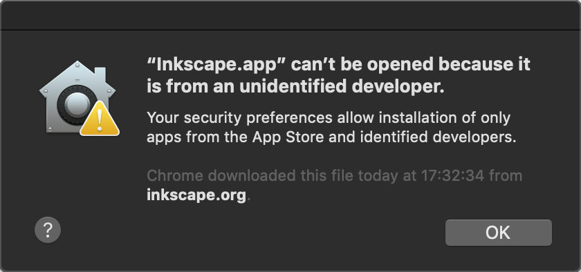 Toward the bottom half of the window it says "Inkscape.app" was blocked from opening because it is not from an identified developer, click on Open Anyway.