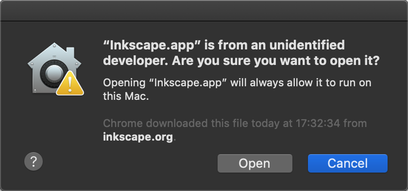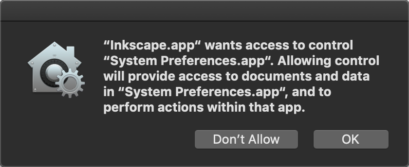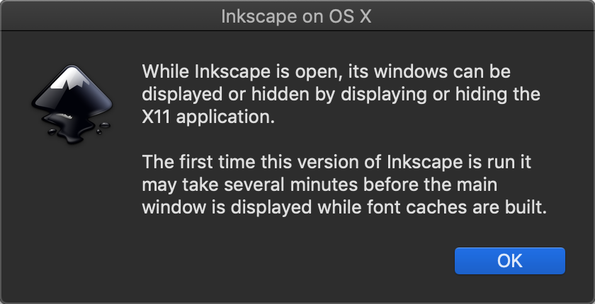 You will get one last message from Inkscape saying that when you run Inkscape, XQuartz will also run. And that the first time the app is run - which is right now - it may take a minute to launch.