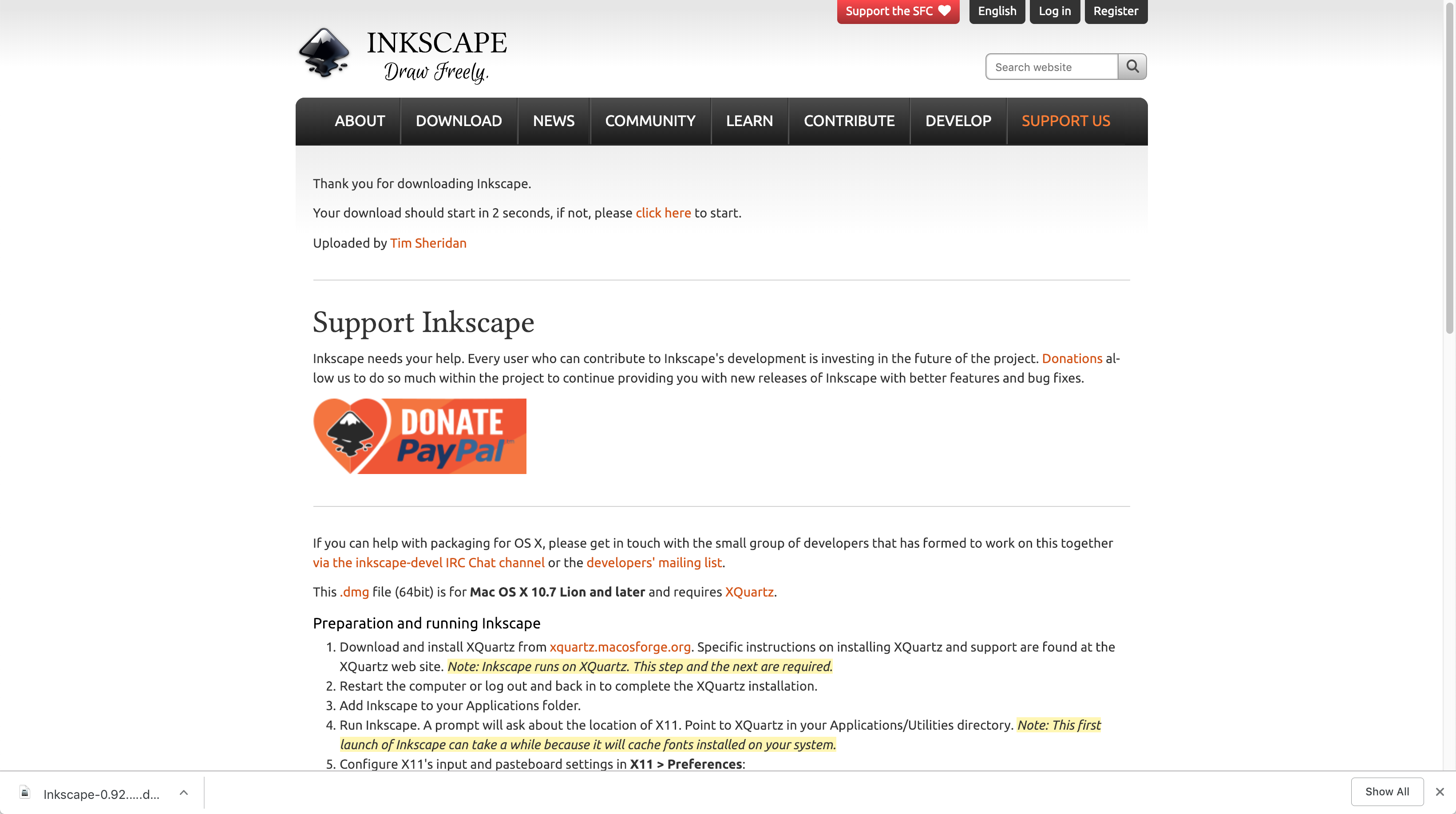 We will not launch the Inkscape installer yet. First, we need to install XQuartz. XQuartz is required for Inkscape to run on Mac OS X with our installation method. Inkscape runs on top of XQuartz. (Kind of weird, but it is what it is).