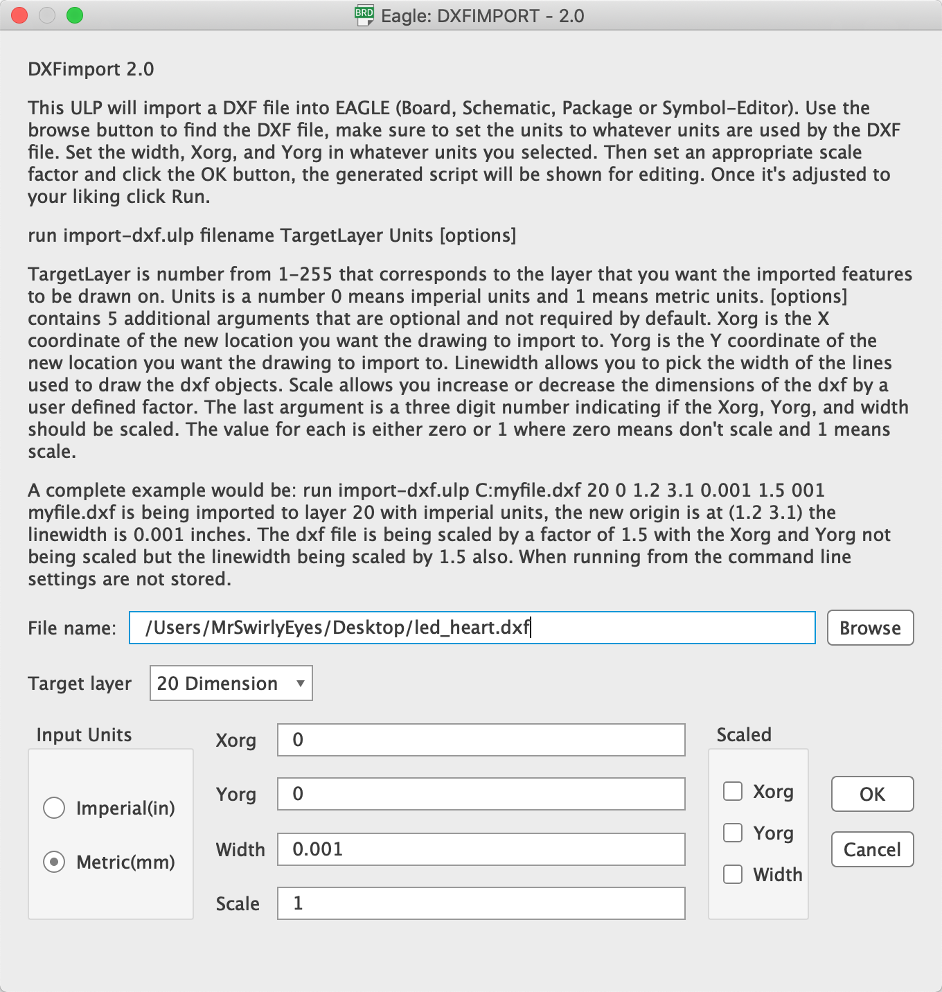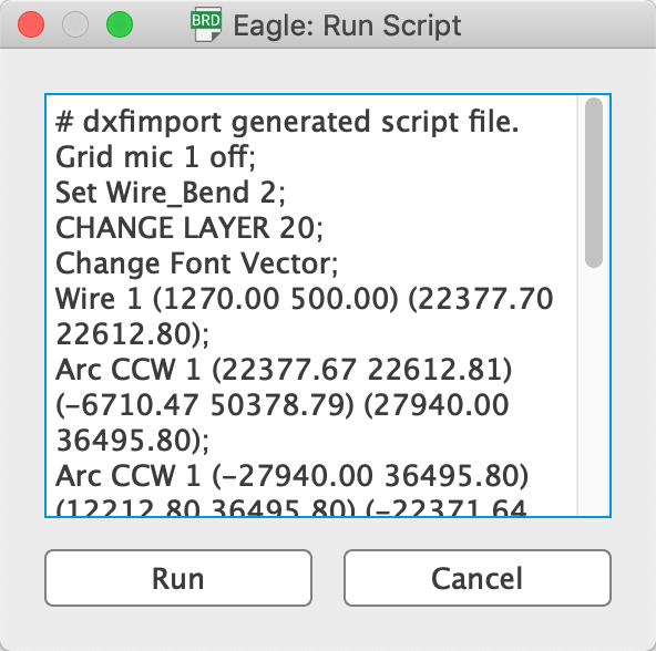 A new window will appear that prepare to run the script that will draw our DXF into the EAGLE .brd file. Click OK to execute the script.