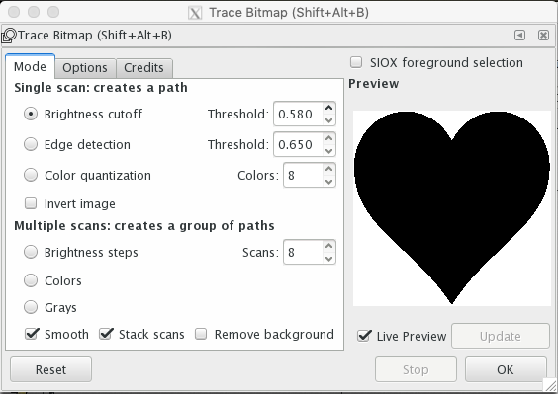 With the shape selected, click Path > Trace Bitmap (or SHIFT+ALT+B). In the window that opens, select live preview and edit the cutoff threshold until you get a good trace of your shape. If your colors are inverted (the shape you want is the lighter portion of the image), click Invert image. This step is why a high contrast image is important, but if thresholding isn’t working for you image, you can experiment with edge detection. For this application, the other options are not useful.