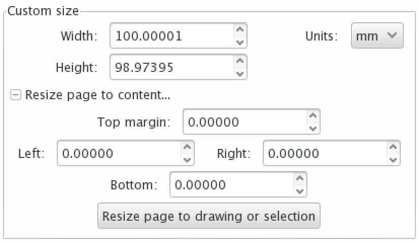 Reset the width to 100mm, in case it got minor adjustments while we were messing with it. Then click on File > Document Properties, Resize page to content, and Resize page to drawing or selection. Now the size of the page should match the containing square of your image.